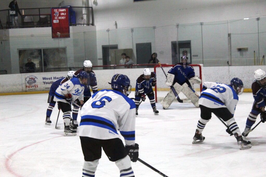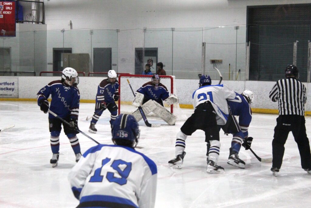 The contest was neck and neck, with excellent defense coming from both teams. With a five-game home stand from Hall, they showed this team who owned the rink. For the majority of the first period, the puck was centered around Suffield’s goal, with swift defense from Suffield’s goalie (72), Kyle Artz. Senior Ben Goldstein (22), and junior Ben Putnam, (34), both students from Hall, maintained clean shots at Suffield’s goal, with an attempted slap shot from No. 9 Jack Croce with the assist of Putnam. It wasn’t until minute 14 that one of the many shots taken resulted in a 5-hole goal from Wildcats No. 12, Brendan Morden, and the game was now at 1-0.