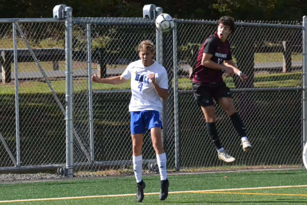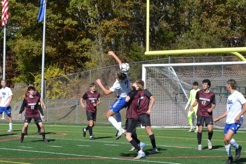 Lincoln Bush (#4) of Hall tries to head the ball past Farmington’s Colin Shtabel. Hall vs. Farmington boys soccer. CCC tournament semifinal. Oct. 25, 2025. Photo credit: Paul Palmer