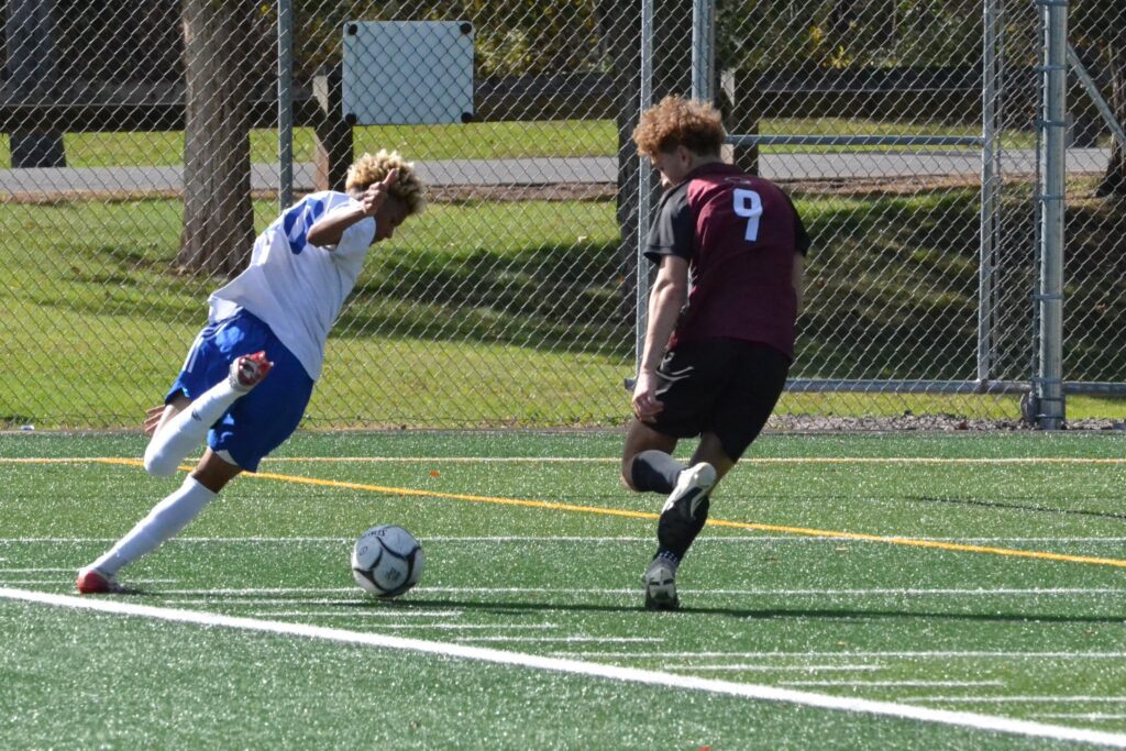 Diego Lemes of Hall tries to cut inside on farmington’s Jacob Carrier. Hall vs. Farmington boys soccer. CCC tournament semifinal. Oct. 25, 2025. Photo credit: Paul Palmer