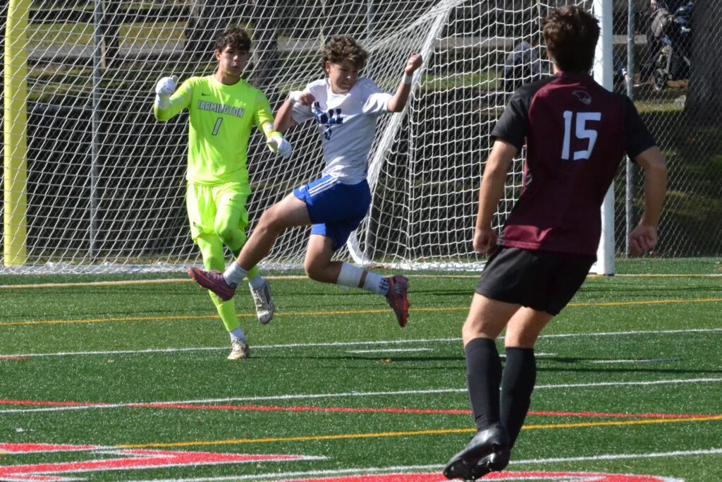 Farmington goalie Dante FIerro clears the ball just ahead of Hall’s Eric Samuels. Hall vs. Farmington boys soccer. CCC tournament semifinal. Oct. 25, 2025. Photo credit: Paul Palmer