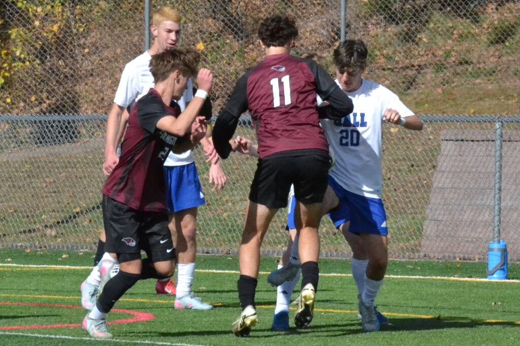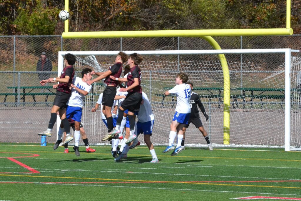 Hall and Farmington players battle on the corner kick in front of the Titans goal. Hall vs. Farmington boys soccer. CCC tournament semifinal. Oct. 25, 2025. Photo credit: Paul Palmer