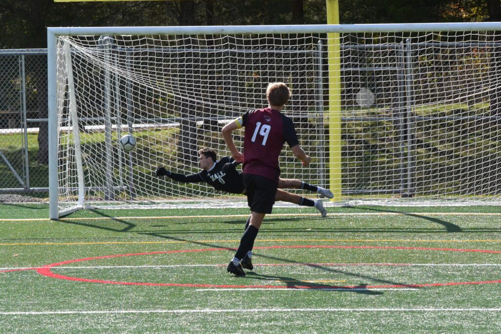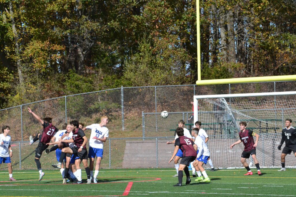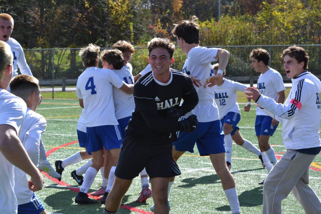 Playing without top scorer Liam Deloreto (injury) and Ryan Rogorzenski, Hall faced an uphill climb, but relying on confidence, team play, and effort, they kept Farmington scoreless in regulation, then hit each of their penalty kicks, and got a save from goalie Rodrigo Ballesteros to win the third matchup.