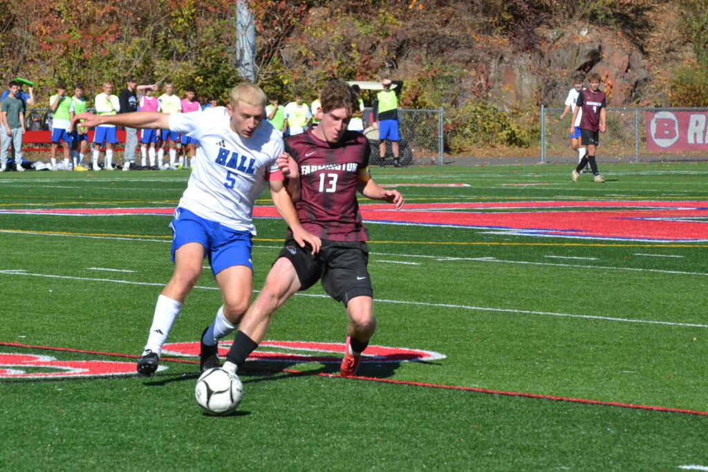 Jeremi Palma Mena of Hall and Jacon Carrier of Farmington race for the ball. Hall vs. Farmington boys soccer. CCC tournament semifinal. Oct. 25, 2025. Photo credit: Paul Palmer