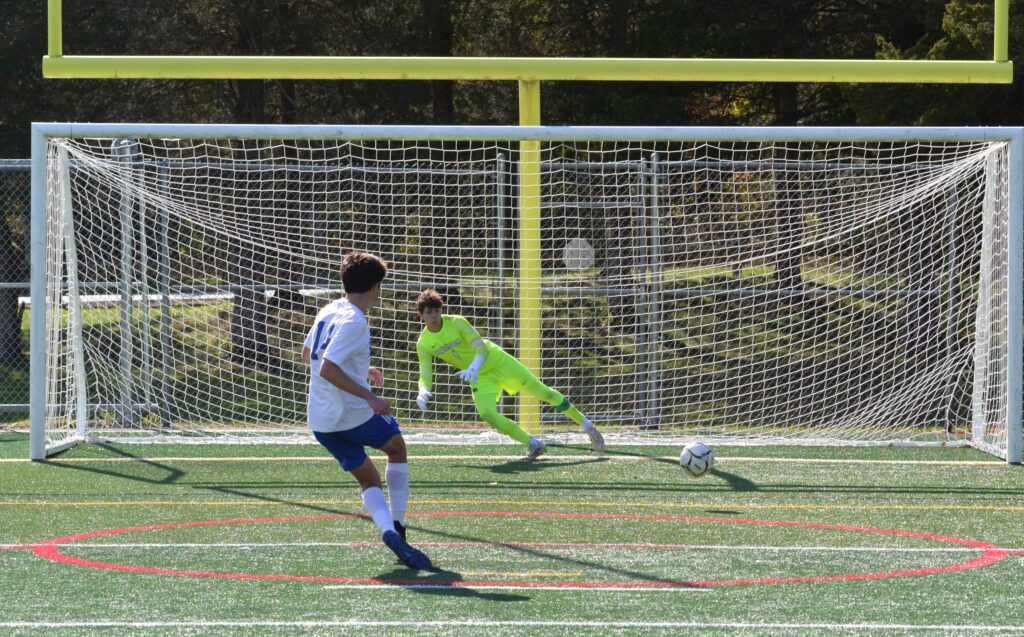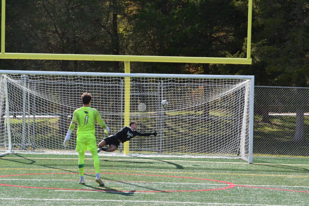 Hall goalie Rodrigo Ballesteros would go full extension to stop the penalty shot from Ian Manton of Farmington. Hall vs. Farmington boys soccer. CCC tournament semifinal. Oct. 25, 2025. Photo credit: Paul Palmer