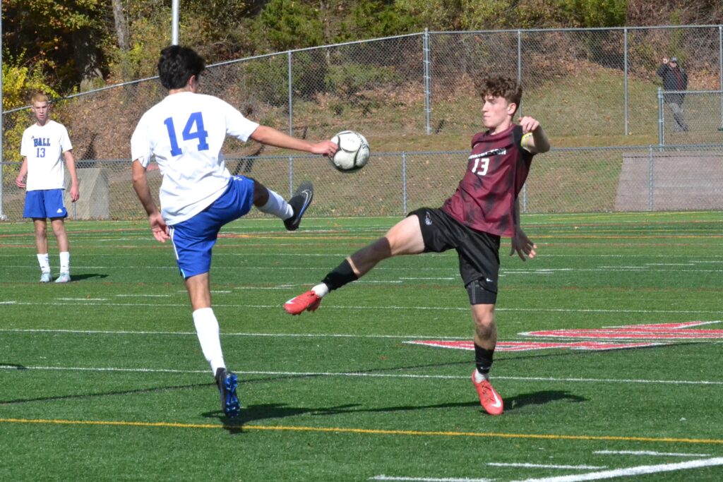 Pearse Deveney (#20) of Hall has the ball trapped between himself and Farmington’s Alex Kutz (#11). Hall vs. Farmington boys soccer. CCC tournament semifinal. Oct. 25, 2025. Photo credit: Paul Palmer
