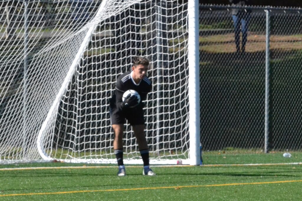 The opening 10 minutes saw the River Hawks get the better of play, earning several dangerous corner kicks. Hall’s defense was up to the task and managed to prevent any good scoring chances on the net of Ballesteros. Keane Muphy of Farmington did get a shot through in the opening quarter of the first, but Ballesteros was able to easily smother the ball.