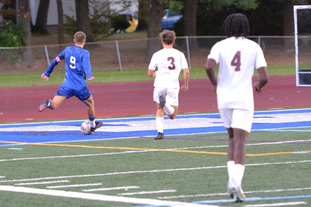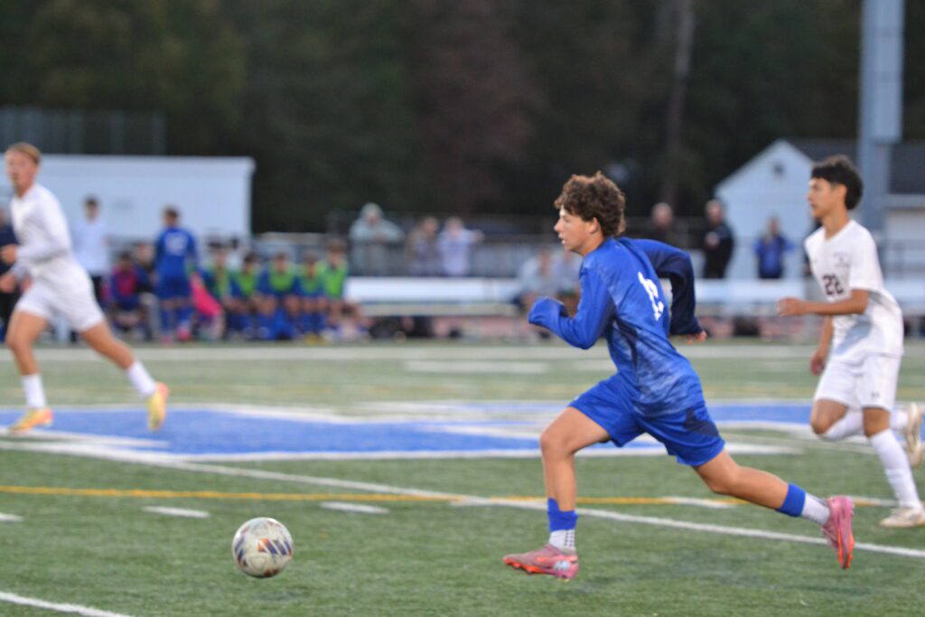 Christian Almeida is in full stride with the ball. Hall vs. Bristol Central boys soccer. Oct. 8, 2025. Photo credit: Paul Palmer