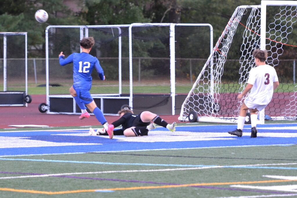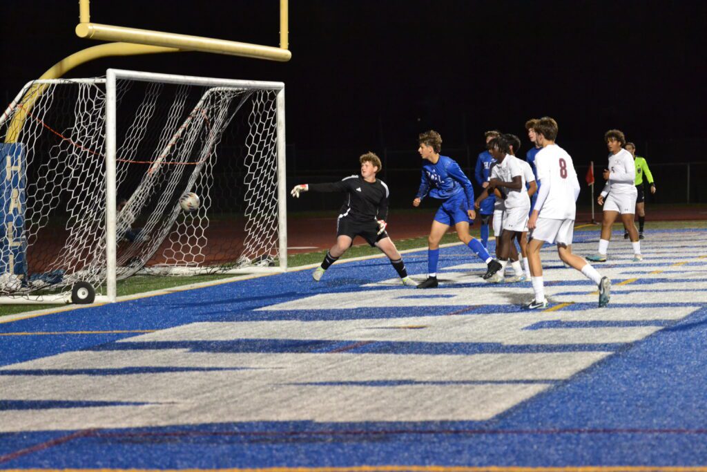 Players react as Lincoln Bush’s header sails towards the post. Hall vs. Bristol Central boys soccer. Oct. 8, 2025. Photo credit: Paul Palmer