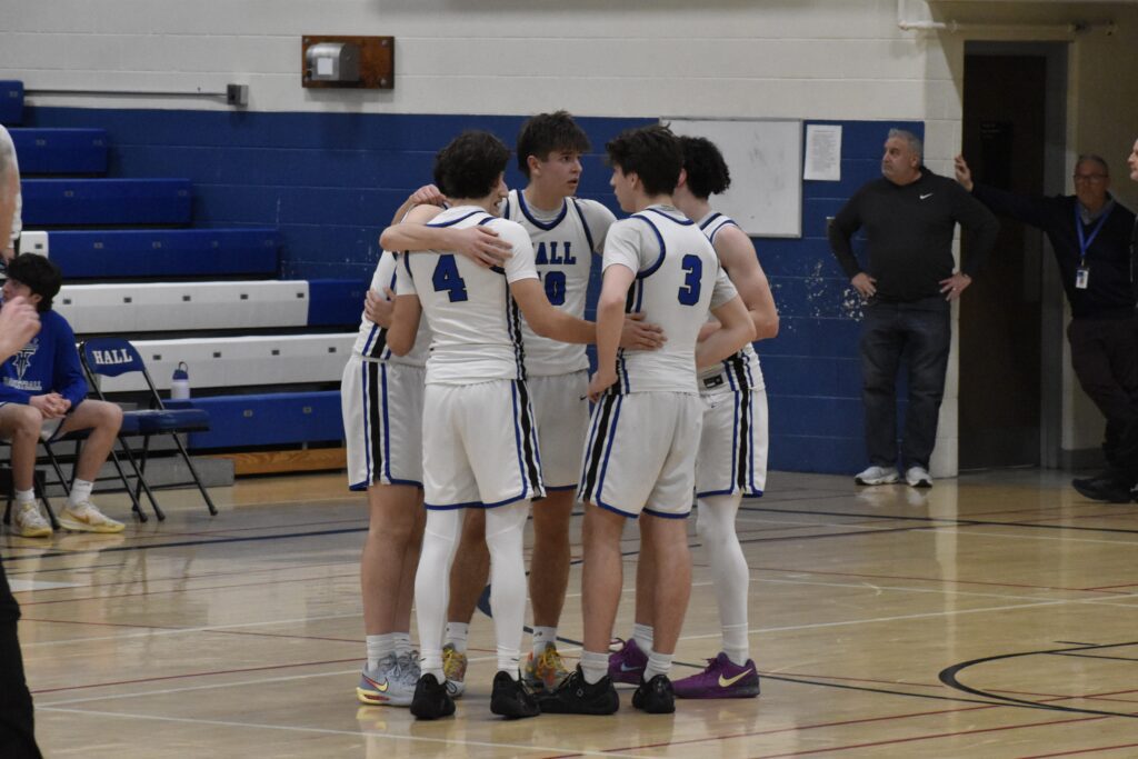 Hall’s lineup communicating on the court. CIAC boys basketball Division II, second round. March 9, 2026. Photo credit: Brooklynn Knowles