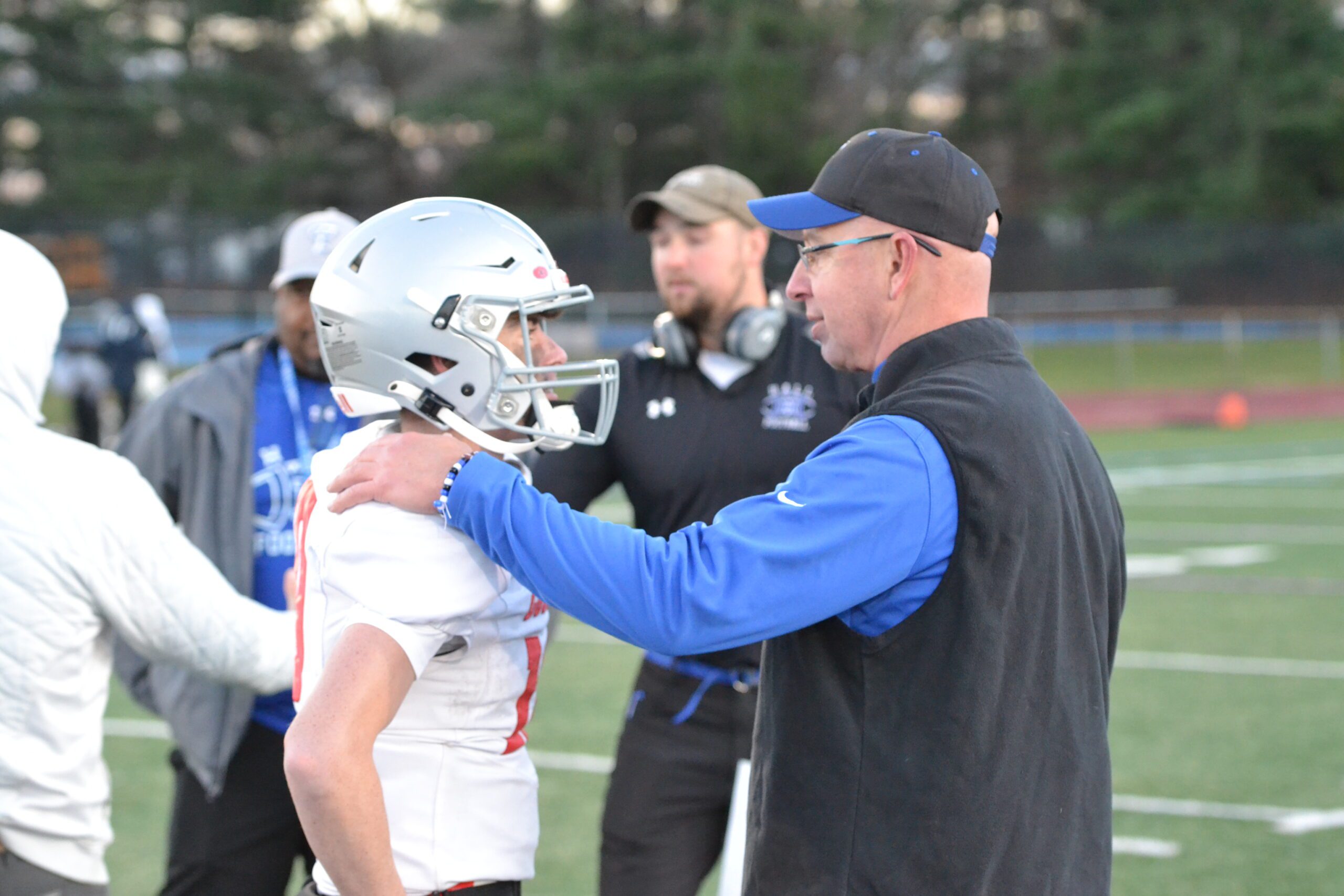 Hall head coach Steve Markie talks with Conard’s Brady Cersosimo after the game
