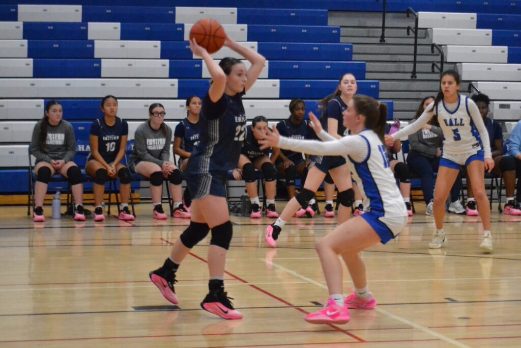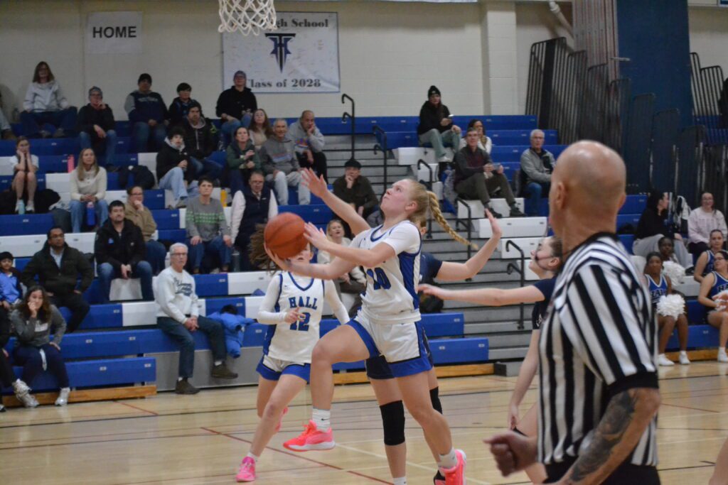 It was truly a fast and furious fourth by Hall as they fought to overcome a decided size advantage against Eastern’s Evins-Mosley and the 3-point shooting of Olivia Viens. Titans senior captain Anya Leshem led the comeback, hitting the team’s first basket in the fourth, later scoring by inbounding the ball off the back of a Lancers player, grabbing the ball, and nailing a 3. When she hit a bankshot 3 with 1:46 to go, it was suddenly a five-point game and Hall had the momentum.