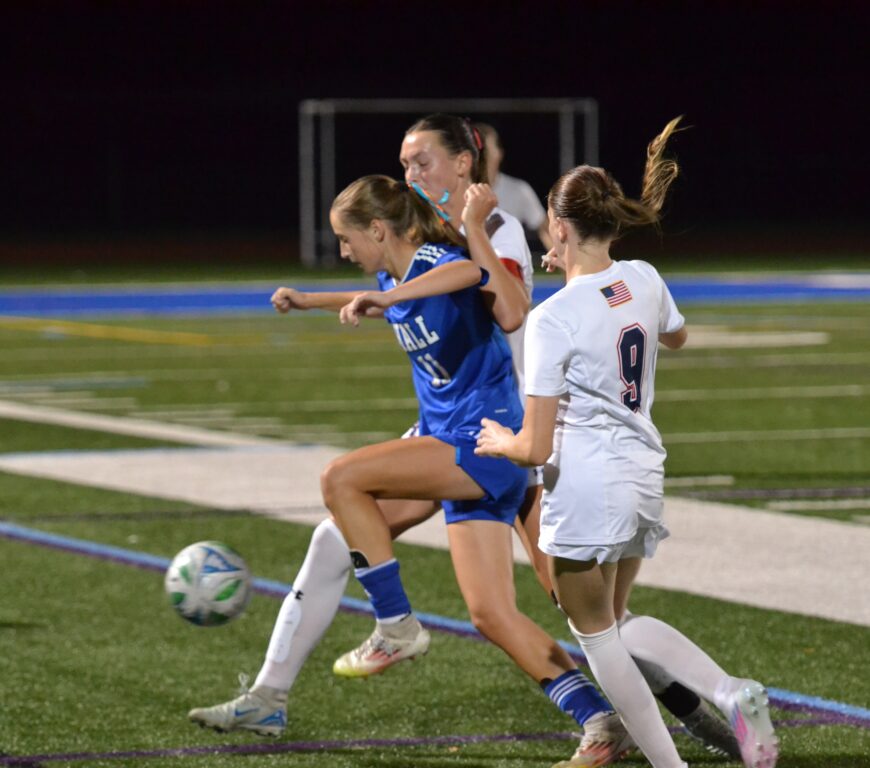 Alex Ackerman is surrounded by Avon players. Hall vs. Avon girls soccer. Oct. 6, 2025. Photo credit: Paul Palmer