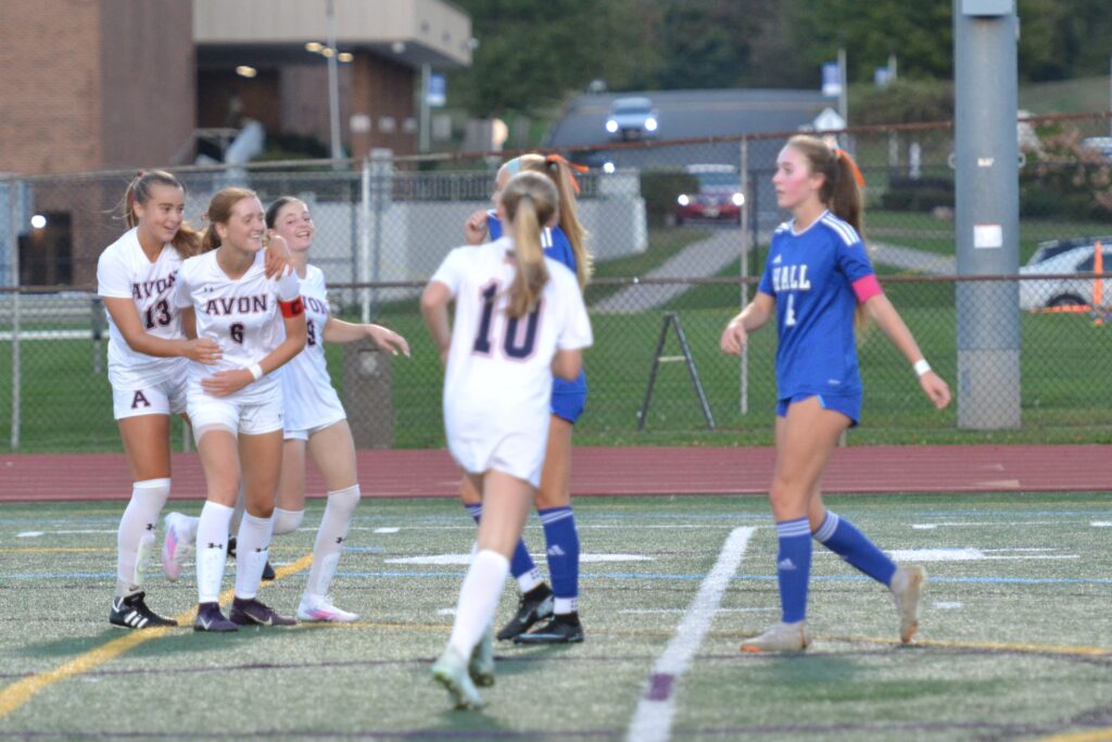 Avon players celebrate a goal against Hall. Hall vs. Avon girls soccer. Oct. 6, 2025. Photo credit: Paul Palmer