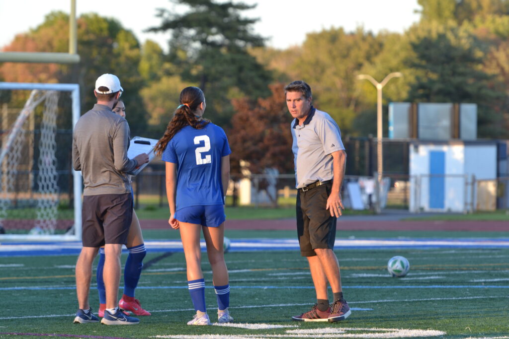Hall coach Scott Ferguson (r) and Mark Corey talk things over with players ahead of the game. Hall vs. Avon girls soccer. Oct. 6, 2025. Photo credit: Paul Palmer