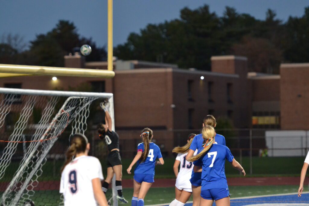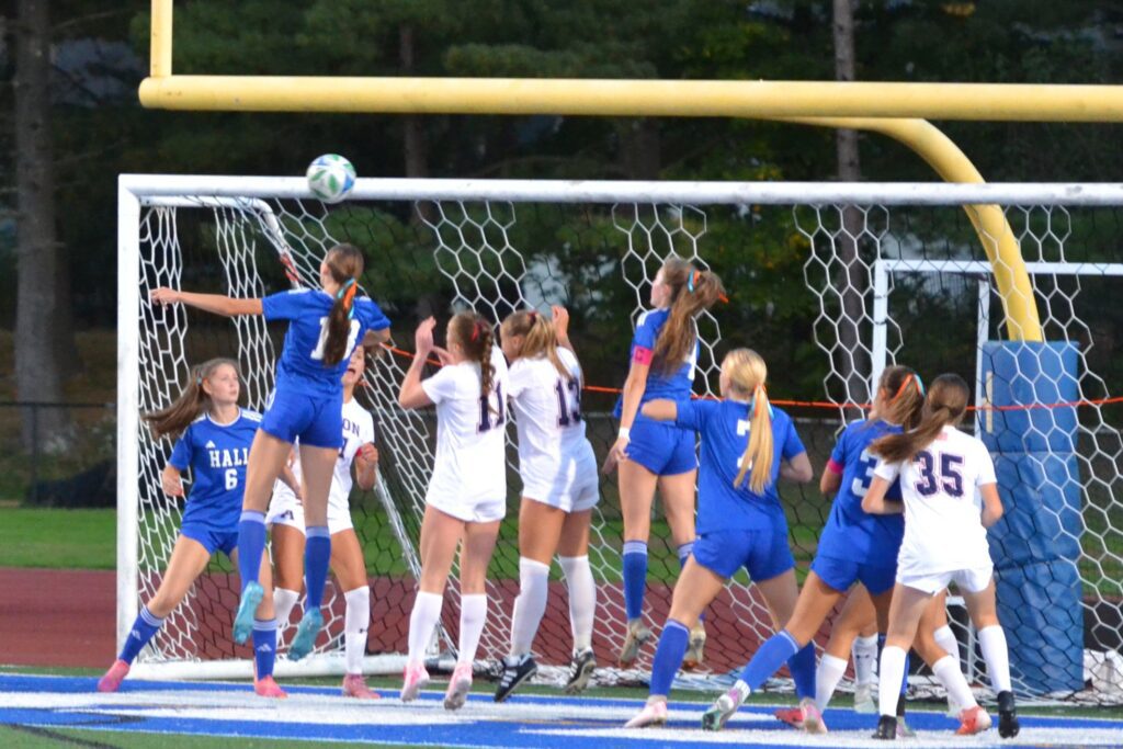 Emma Loparco’s long free kick would be kncoled away at the far post by Hall goalie Sadie Leibin. Hall vs. Avon girls soccer. Oct. 6, 2025. Photo credit: Paul Palmer
