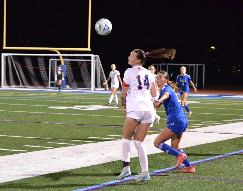 Maya Reilly’s header would go just wide for Hall. Hall vs. Avon girls soccer. Oct. 6, 2025. Photo credit: Paul Palmer