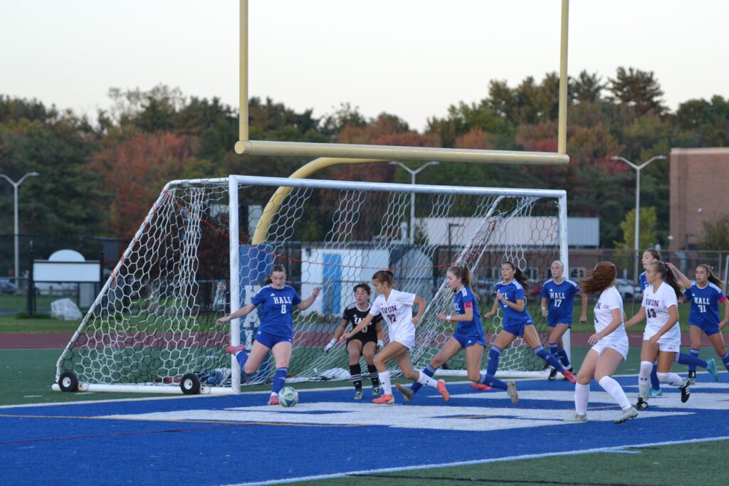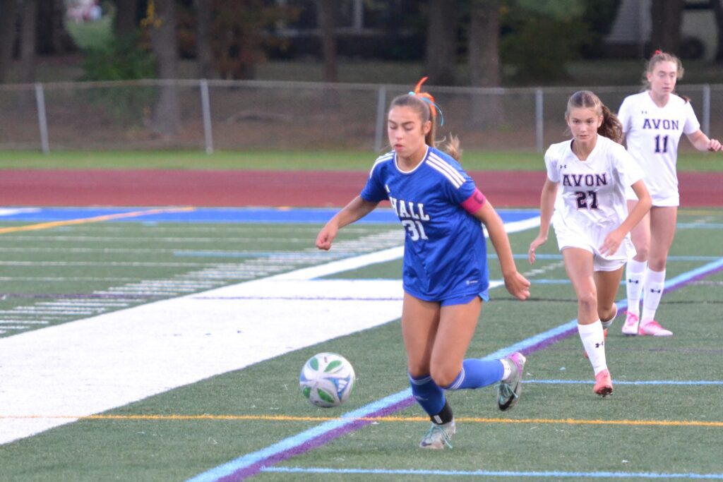 Three minutes later Avon’s pressure would pay off as the Falcons’ Alana Garza fired a right-footed shot from about 25 yards out that sailed past the outstretched hands of Hall goalie Sadie Leibin for the 1-0 lead. Hall managed to find a better balance of play after the Avon goal.