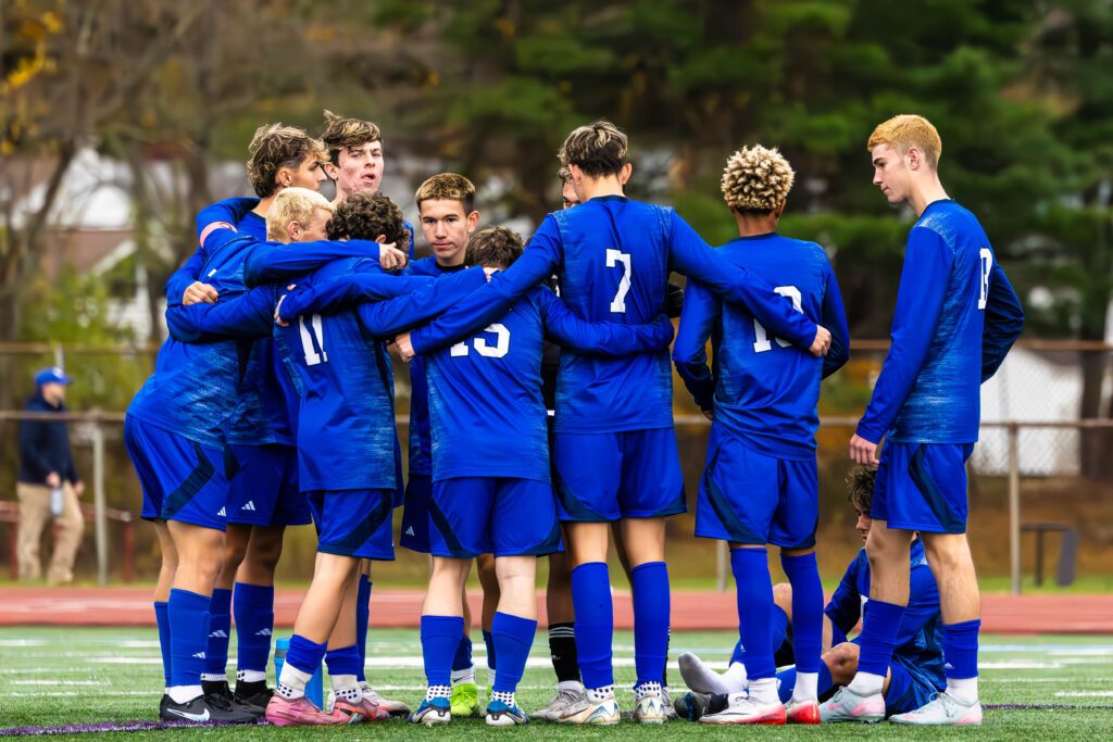 The Titans are strategizing before the 2nd half . Hall vs. Brien McMahon boys soccer. Class LL second round. Nov. 3, 2025. Photo credit: Savannah Cote