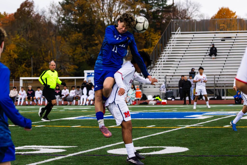Lincoln Bush is fighting for possession. Hall vs. Brien McMahon boys soccer. Class LL second round. Nov. 3, 2025. Photo credit: Savannah Cote