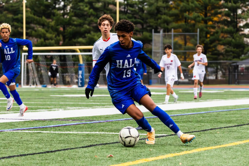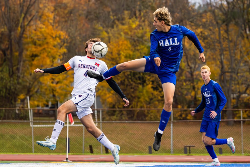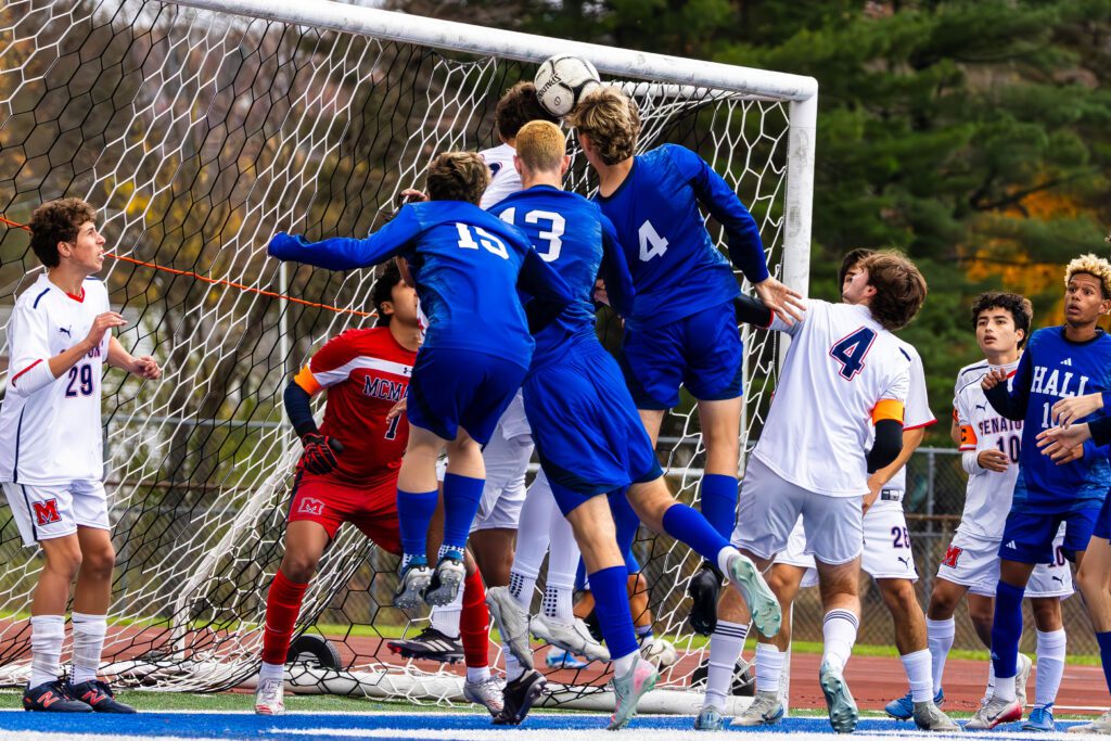 The Hall boys’ soccer team continues its pursuit of a state title after a commanding 4-1 victory over Brien McMahon (Norwalk) on Monday afternoon at home in West Hartford. With the win, No. 9 seed Hall moves on to the quarterfinals, where they will face No. 1 Naugatuck on Thursday afternoon.
