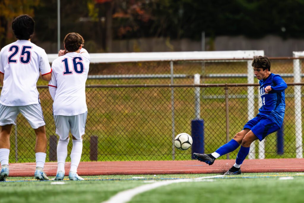 Marco Leonidas is attempting a free kick. Hall vs. Brien McMahon boys soccer. Class LL second round. Nov. 3, 2025. Photo credit: Savannah Cote