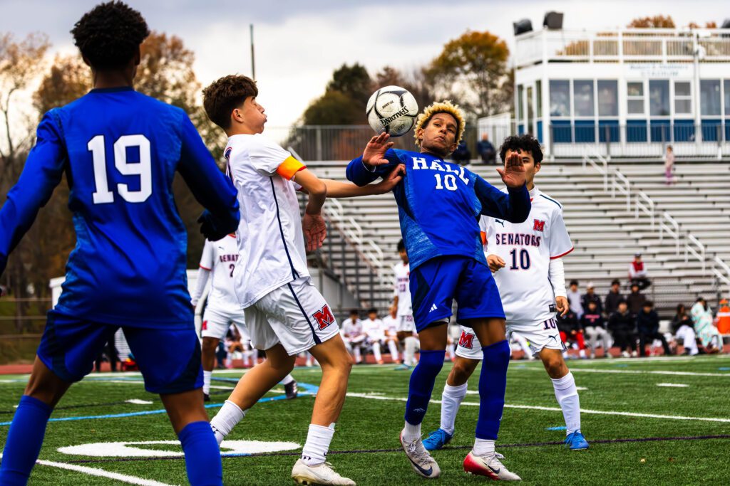 Just minutes later, Hall struck again – this time in an unexpected way. With 27:15 remaining, a long throw-in from Debin caused chaos in front of the Brien McMahon goal. As players scrambled to clear it, the ball deflected off a McMahon defender and into the net for an own goal, putting Hall ahead 3-1. Christmas came early for the Hall Titans and it was a fortunate bounce that reflected Hall’s constant pressure and sharp execution on set pieces.