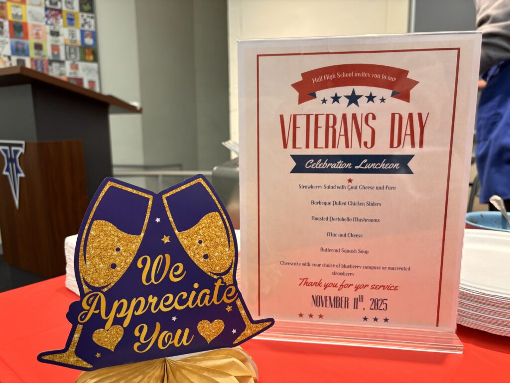 This heartfelt celebration honored the veterans in our Hall and West Hartford family. To honor those who served, a buffet style lunch was prepared and served on Tuesday, Nov. 11, with pulled chicken patties and mac and cheese being the main course. Veterans sat and shared stories of their time serving while they ate. All bonded over the amazing food.