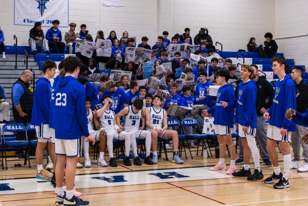 The Hall Titans’ bench and student section create a charged atmosphere during Thursday night’s rivalry matchup against Conard. Hall vs. Conard boys basketball. Jan. 22, 2026. Photo credit: Savannah Cote