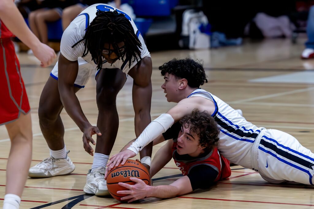 The Titans and Red Wolves are fighting for possession. Hall vs. Conard boys basketball. Jan. 22, 2026. Photo credit: Scott Sulkazi