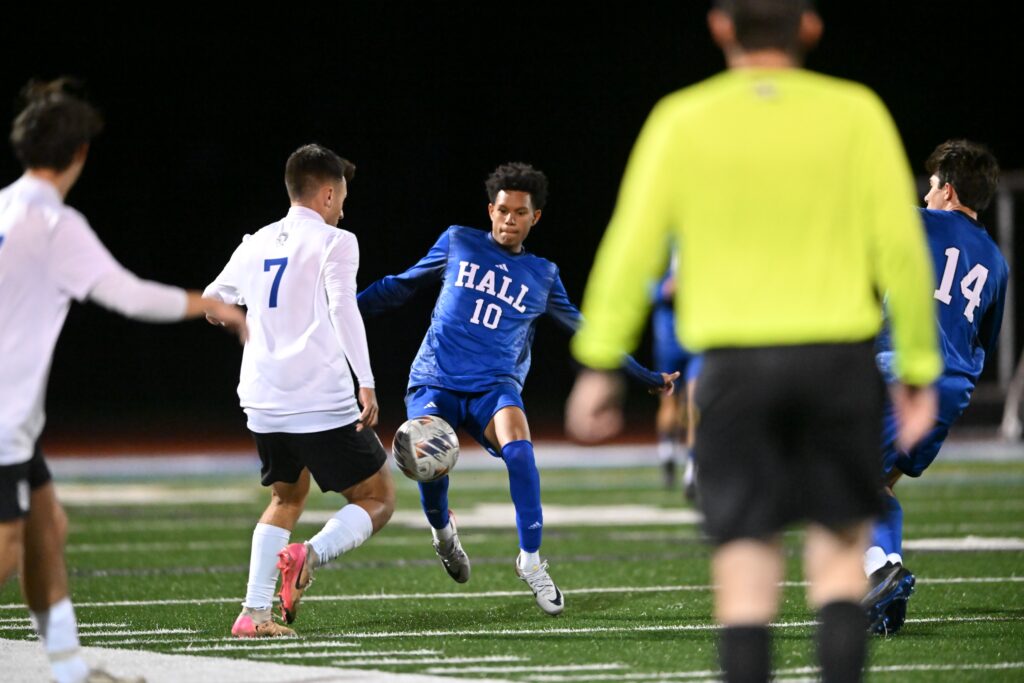 Aidan Winiarski (7) sent one in with 23:28 in the first half, but the goalie got his hands on it. After the rocky start, Hall found their rhythm with great combinations and technicality in the midfield. Lewis Mills had the determination to win this game and put high pressure on Hall’s goalkeeper, Rodrigo Ballesteros (0).
