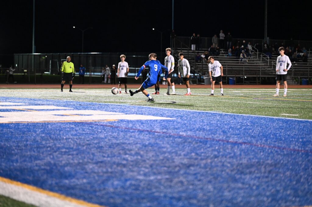 Captain Liam Deloreto scores on a PK. Hall boys soccer vs. Lewis Mills Senior Night. Oct. 17, 2025. Photo credit: Craig Rosenberg