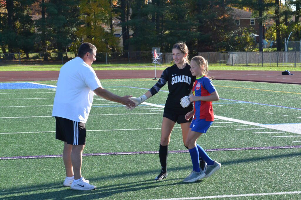 Conard goalie Evelyn Black is escorted by a youth soccer player, and greets her coach PJ Louis. Hall vs. Conard girls soccer. Oct. 21, 2025. Photo credit: Paul Palmer