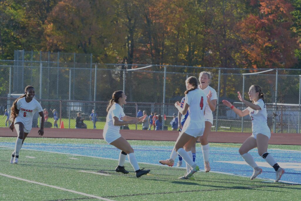 Conard teammates congratulate Paige Sweeney (4) after her goal. Hall vs. Conard girls soccer. Oct. 21, 2025. Photo credit: Paul Palmer