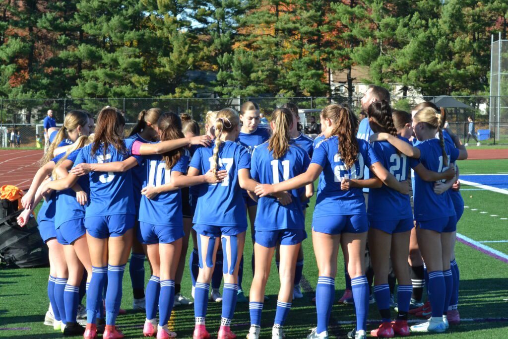 Hall players huddle before the game. Hall vs. Conard girls soccer. Oct. 21, 2025. Photo credit: Paul Palmer