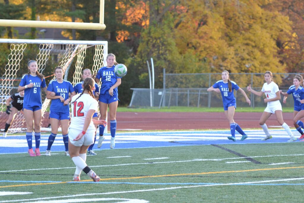 Alex Ackerman takes the free kick for Hall. Hall vs. Conard girls soccer. Oct. 21, 2025. Photo credit: Paul Palmer