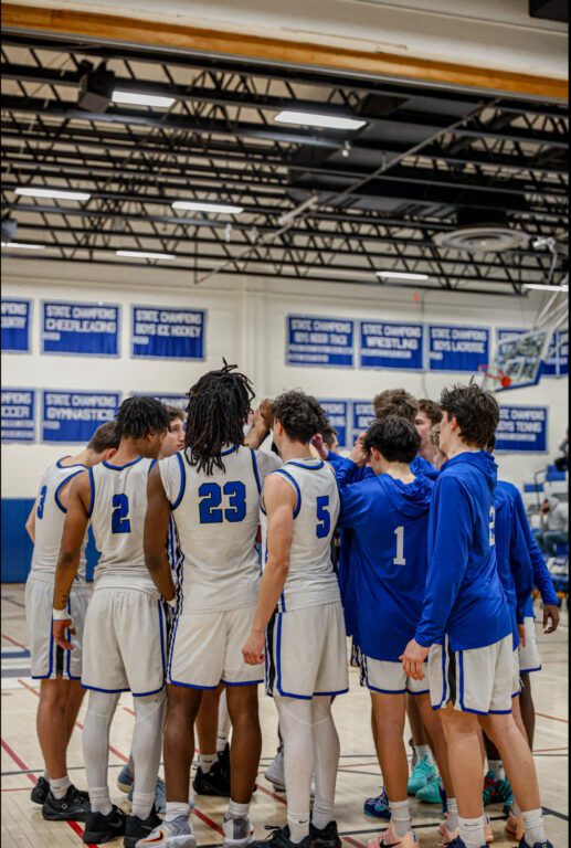 Hall Boys gather in final huddle before the game commences. Hall vs. Northwest Catholic boys basketball. Feb. 10, 2026. Photo credit: Jackson Tucker