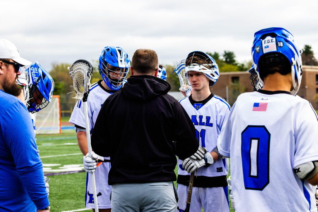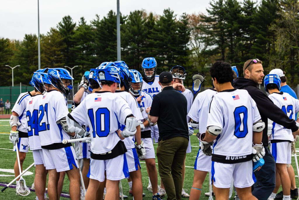 Coach Keith Blum speaks with the team. Hall vs. Farmington boys lacrosse. April 18, 2026. Photo credit: Savannah Cote