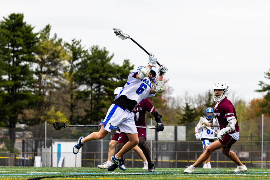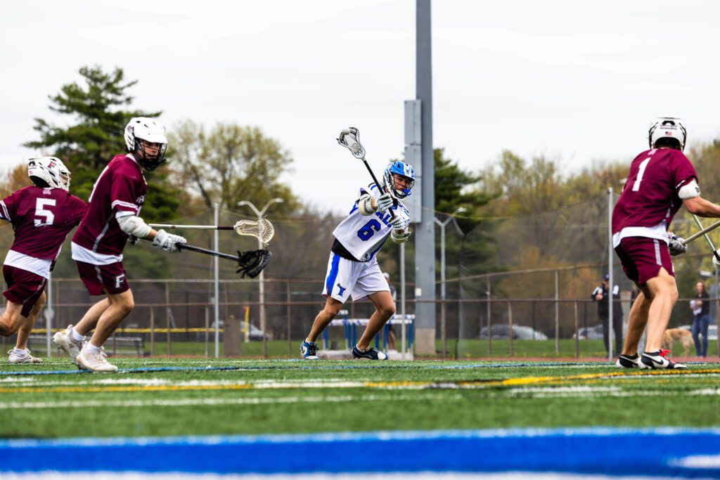 Connor McHugh trying to get an offensive drive going. Hall vs. Farmington boys lacrosse. April 18, 2026. Photo credit: Savannah Cote