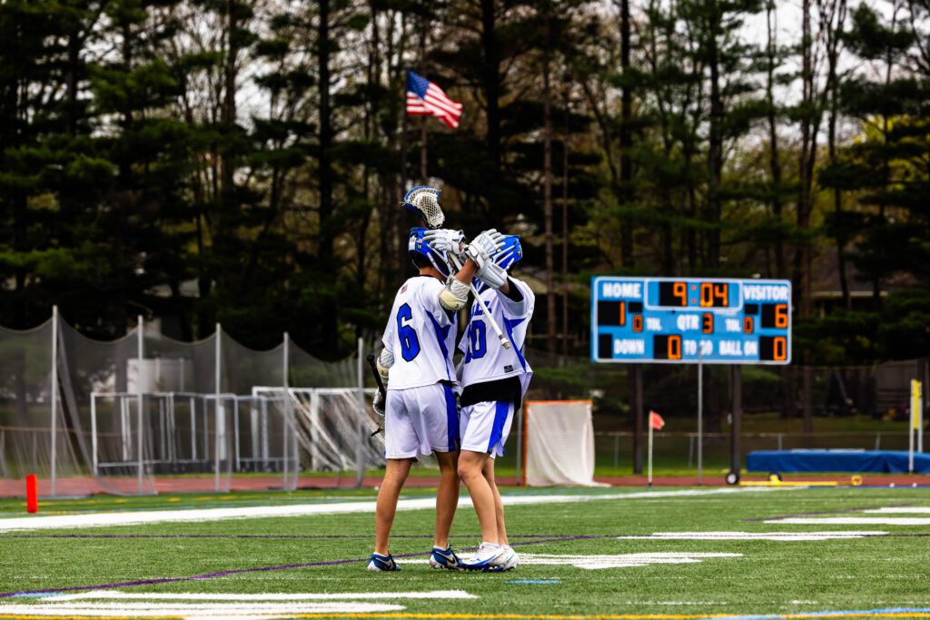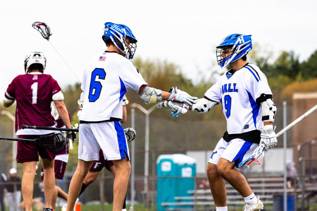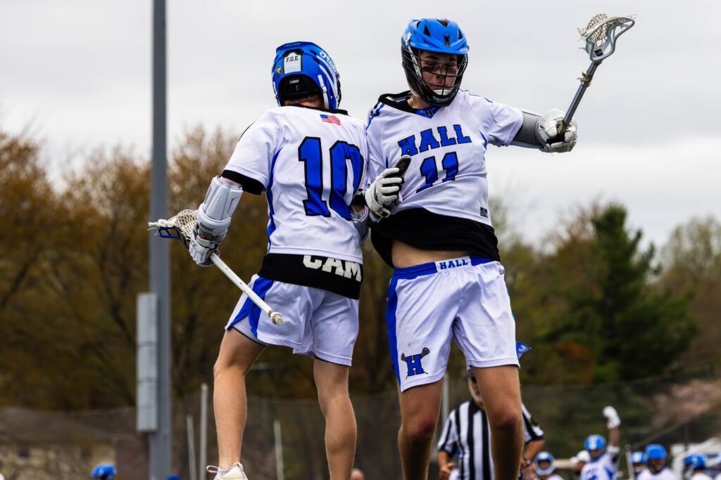 Hall players celebrate a goal. Hall vs. Farmington boys lacrosse. April 18, 2026. Photo credit: Savannah Cote