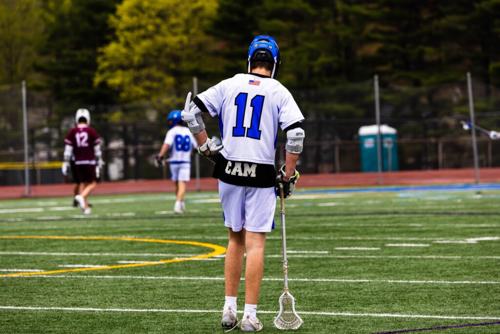 Hall with back plates,labeled “Cam” after the tragic death of teammate Cam Siegal. Hall vs. Farmington boys lacrosse. April 18, 2026. Photo credit: Savannah Cote