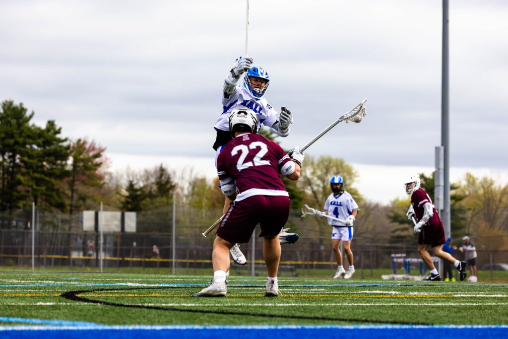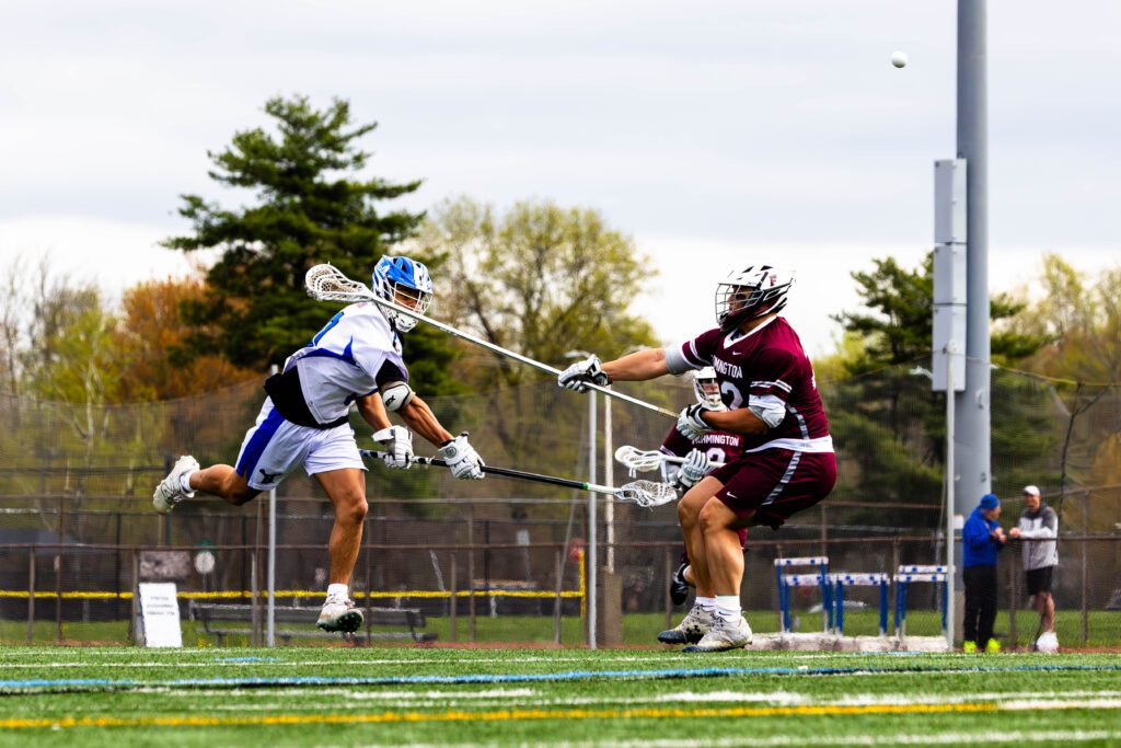 Hall player fighting for possession. Hall vs. Farmington boys lacrosse. April 18, 2026. Photo credit: Savannah Cote