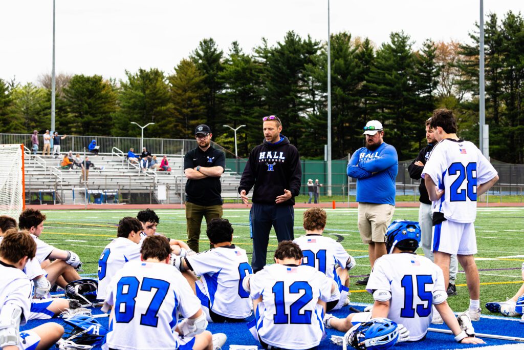 Hall coach Keith Blum speaks with the team during halftime. Hall vs. Farmington boys lacrosse. April 18, 2026. Photo credit: Savannah Cote