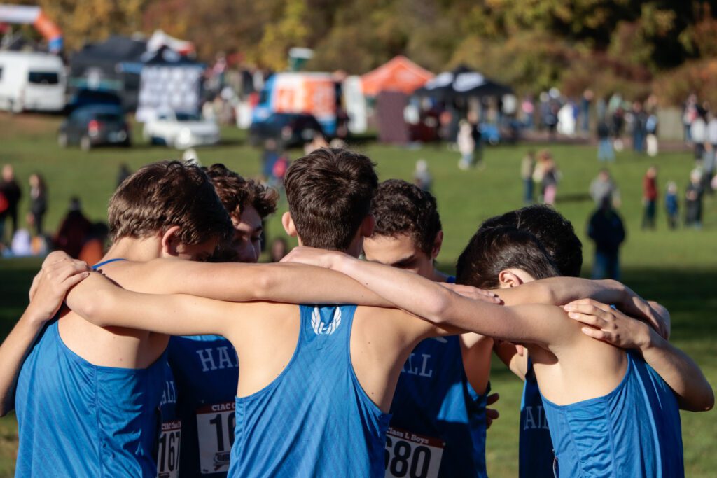 Hall Boys Prerace Huddle. CIAC Class L Division State Championships. Oct. 25, 2025. Photo Credit: Jackson Tucker + Bramley Cyr