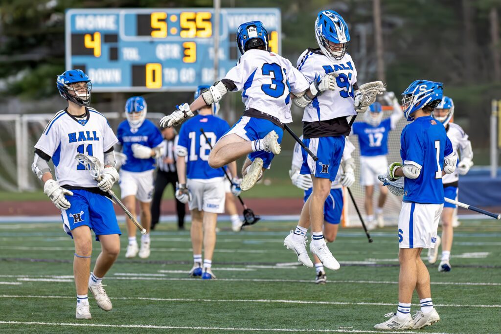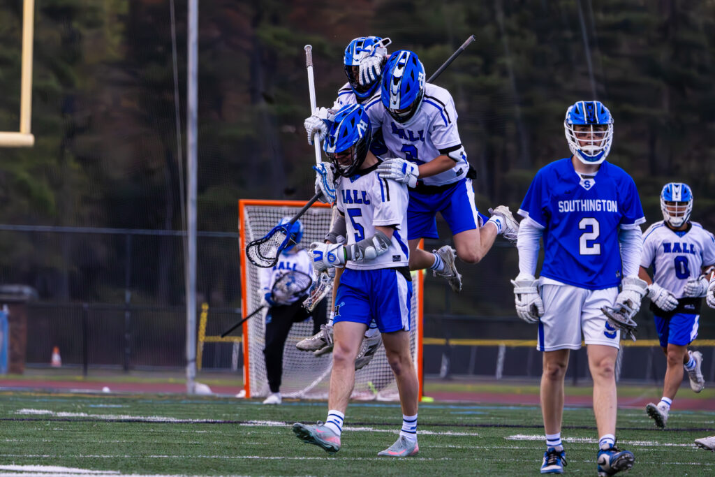Hall celebrating a goal. Hall vs. Southington boys lacrosse. April 20, 2026. Photo credit: Savannah Cote
