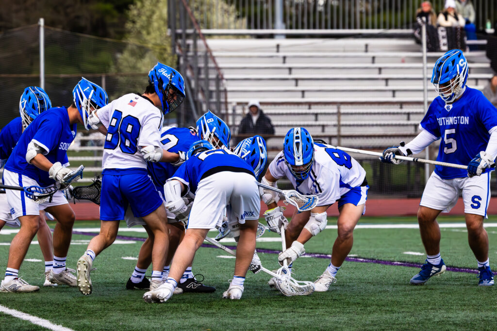 Hall and Southington fight for possession. Hall vs. Southington boys lacrosse. April 20, 2026. Photo credit: Savannah Cote