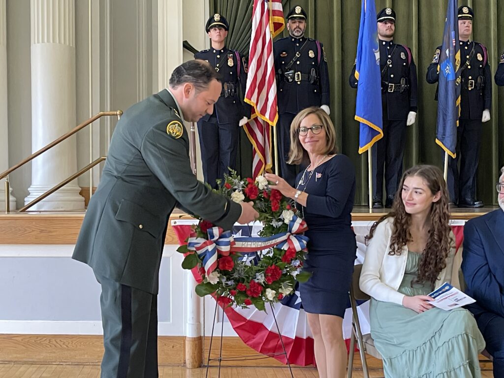 Mayor Shari Cantor, who followed Slap, introduced Town Council members, police and fire chiefs, and town executives in the room. She then paused to thank Ben Cooper, sitting a few feet in front of her. “Ben has seen the worst of humanity but has taught us all the best of humanity. I’m so grateful every time I see him, it just moves me to my core.”