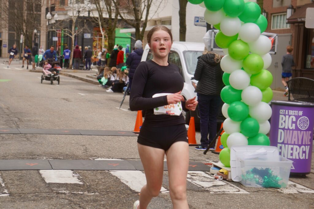 Jillian Agarwal was the first female to cross the finish line of the 5K, in 19:28.67. Johnny’s Jog for Charity. March 22, 2026. Photo credit: Ronni Newton