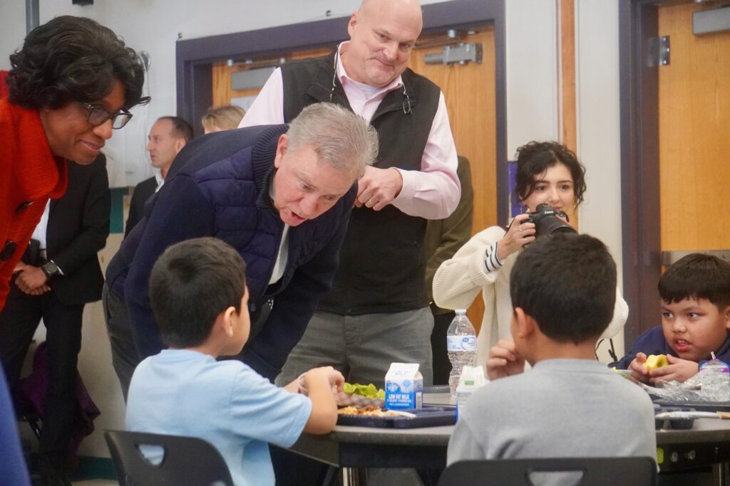Gov. Ned Lamont (center), Education Commissioner Charlene Russell-Tucker (left), and West Hartford Food Services Director Tim Prosinski speak with students before a press conference at Smith STEM School. Feb. 5, 2026. Photo credit: Ronni Newton