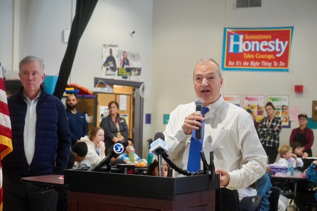 Gov. Ned Lamont was at one of West Hartford’s elementary schools on Thursday morning, announcing a line item in his proposed budget that would ensure all of Connecticut’s roughly 500,000 public students have access to a nutritious meal before the start of the school day, at no cost to to families.
