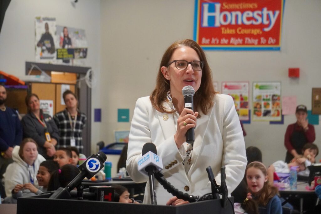 Mayor Shari Cantor speaks at a press conference at Smith STEM School in West Hartford. Feb. 5, 2026. Photo credit: Ronni Newton
